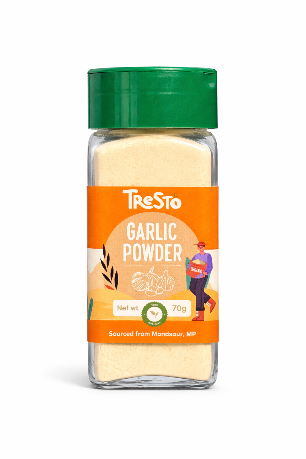 Our Tresto Garlic Powder (70g) is made using fresh garlic bulbs sourced from Mandsaur, one of India’s top garlic-growing regions. Known for its strong aroma and flavour-rich garlic, Mandsaur’s produce is widely appreciated by chefs and home cooks. The garlic is carefully cleaned, dehydrated, and finely powdered without any artificial colors, preservatives, or fillers.